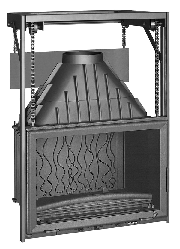 La puerta se abre y se cierra lateralmente para conseguir el mejor rendimiento energético del hogar cuando este está cerrado. También se desliza verticalmente mediante un sistema de contrapesos. Por ello, esta puerta elevable permite disfrutar ocasionalmente de un hogar de chimenea tradicional.