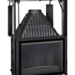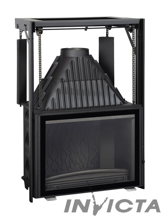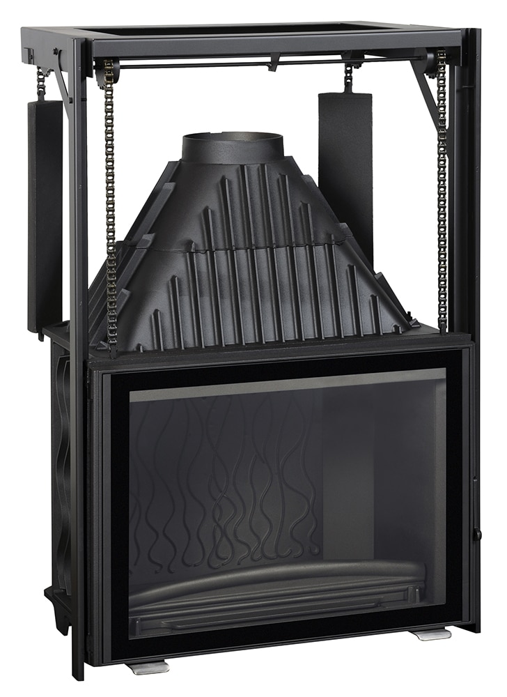 La puerta se abre y se cierra lateralmente para conseguir el mejor rendimiento energético del hogar cuando este está cerrado. También se desliza verticalmente mediante un sistema de contrapesos. Por ello, esta puerta elevable permite disfrutar ocasionalmente de un hogar de chimenea tradicional.