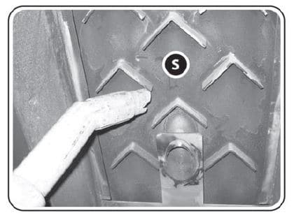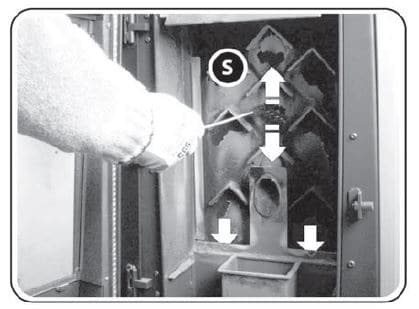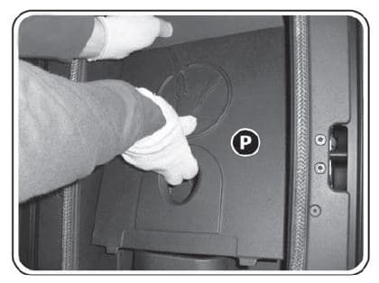 Démontez les parties amovibles telles que la plaque supérieure (déflecteur), les plaques latérales et la plaque foyère (P). Nettoyez soigneusement l’échangeur de chaleur (S) à l’aide de la brosse à 90° fournie avec l’appareil de chauffage. Aspirez ensuite la suie et les cendres résiduelles.