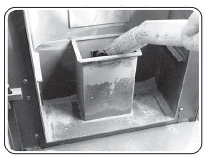 Retirez le cendrier (H) de la chambre de combustion, et videz les cendres qu’il contient dans un container métallique adapté. En utilisant un aspirateur à cendres spécifique, aspirez les cendres résiduelles du cendrier. Aspirez également tout la cendre qui s’est déposée dans le compartiment du cendrier ou sur la porte du poêle à pellets.