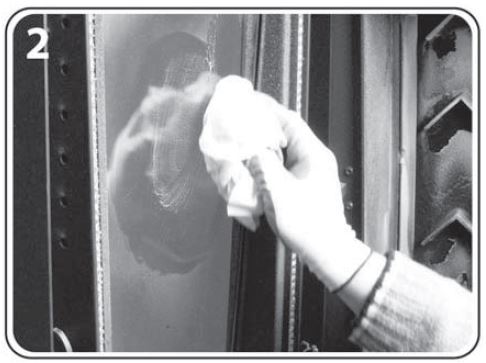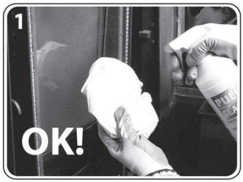 Le nettoyage est un moment sensible, car il ne faut surtout pas endommager la vitre ou l’appareil. Nous vous recommandons donc d’utiliser des produits adaptés. Évitez les éponges ou de chiffons abrasifs. Ils rayent la vitre de manière irréversible. Ne pulvérisez jamais de produit à vitre directement sur la vitre (3) pour éviter qu’il ne coule sur les joints ou les surfaces métalliques de votre appareil. La meilleure technique de nettoyage de la vitre consiste à pulvériser une petite quantité de nettoyant sur un chiffon doux (1) et de frotter ensuite les surfaces encrassées (2).