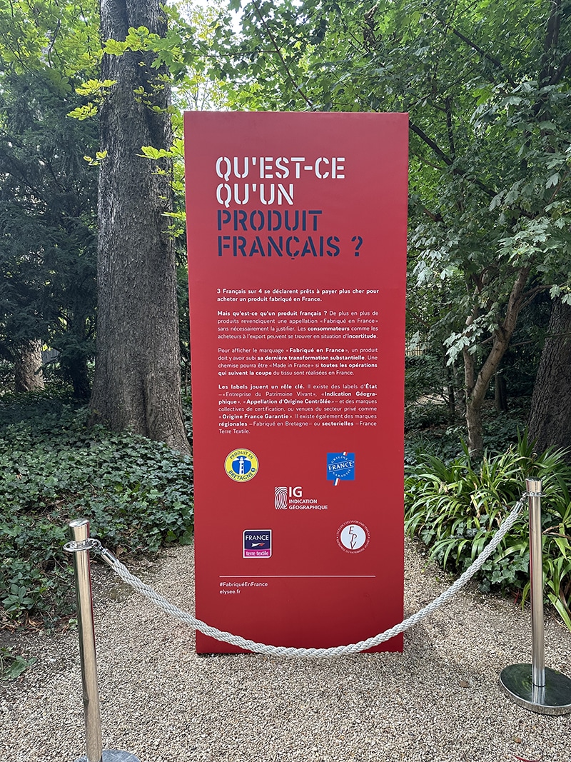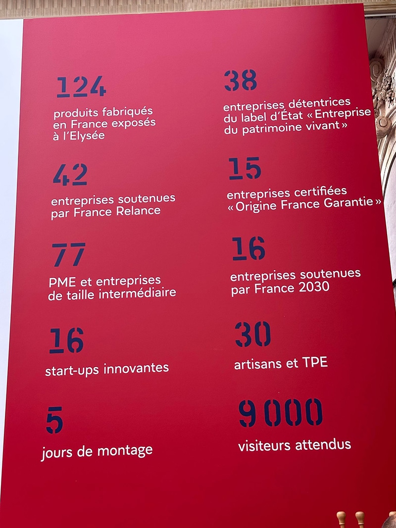 Depuis 3 éditions, la Grande Exposition du Fabriqué en France met en lumière pendant deux jours des produits et des savoir-faire français. Entreprises, artisans, producteurs et industriels sont sélectionnés pour leur engagement dans la fabrication française. Les visiteurs découvrent ainsi une sélection d’une centaine de produits remarquables exposés dans les salons de l’Élysée.