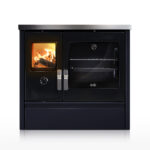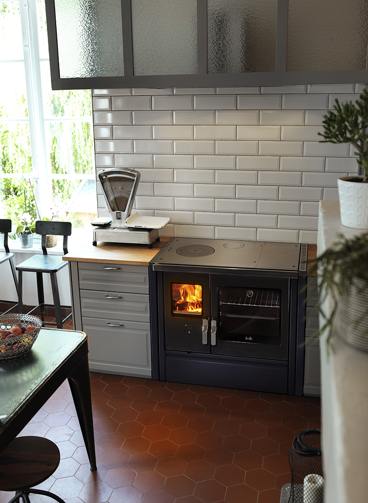 Dans la cuisine, les cordons bleus testent de nouvelles recettes qui rôtissent dans le four ou mijotent sur le dessus en fonte du fourneau. Dans toute la maison, la chaleur générée par les bûches enflammées se propage via le circuit de chauffage central connecté à la cuisinière Mélisse 90 hydro.