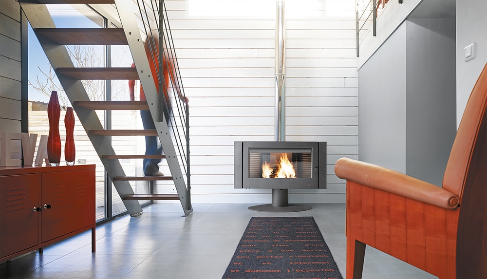 Le système vitre propre permet de ralentir l’encrassement du vitrage. Une arrivée d’air sur le haut de la vitre crée un voile de protection. L’ air préchauffé est propulsé le long du vitrage. Il déclenche la combustion des gaz et des matières volatiles protégeant ainsi la vitre contre la fumée et le dépôt de suie.